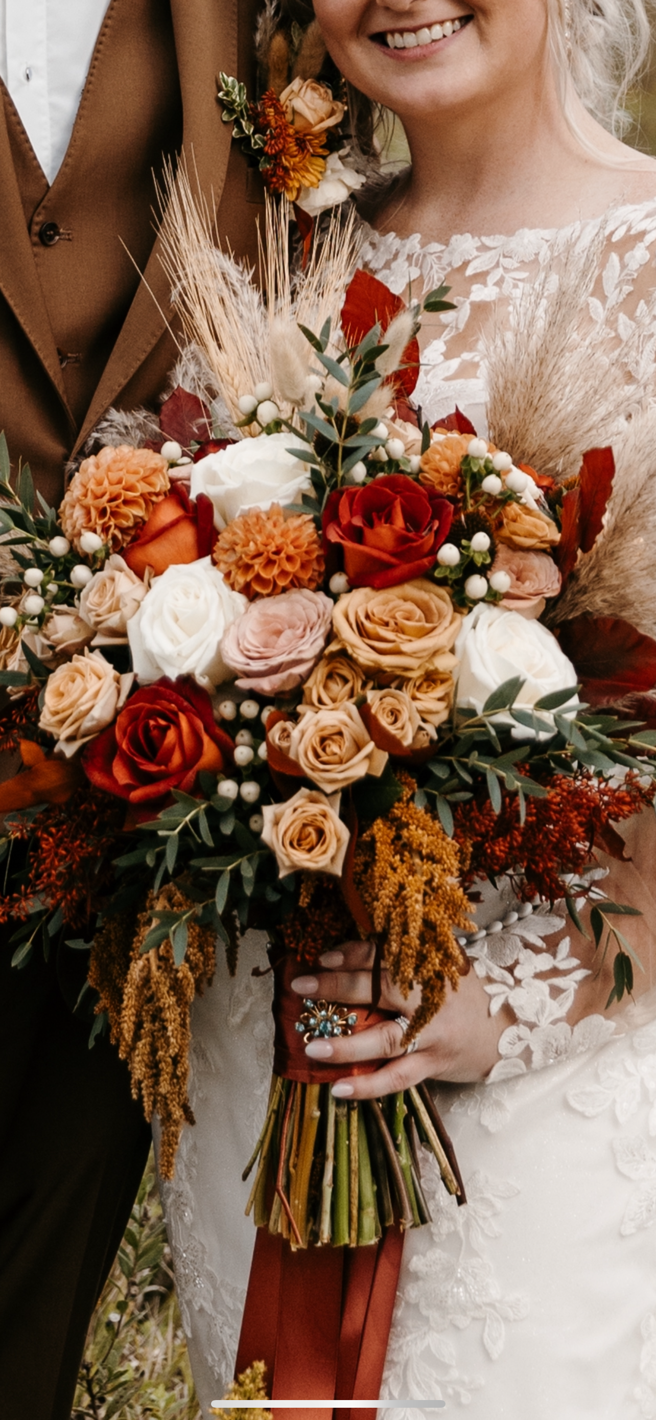 A lush, fall-inspired bridal bouquet overflowing with warm romance. Packed with rich red and burnt orange roses, buttery caramel sprays, creamy whites, and soft blush blooms, this bouquet blends autumn texture with timeless elegance. Wheat, pampas, and amaranthus add cozy, harvest-season charm, while lush greenery and crisp fall foliage give it depth and movement. Wrapped in a deep rust ribbon, it’s the perfect balance of bold, earthy, and dreamy—made for a bride who loves fall as much as she loves a little drama.